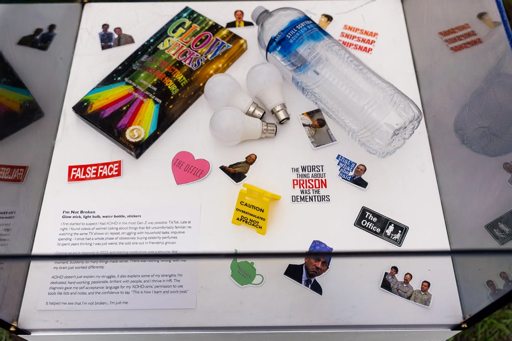 Glow stick, light bulb, water bottle, stickers