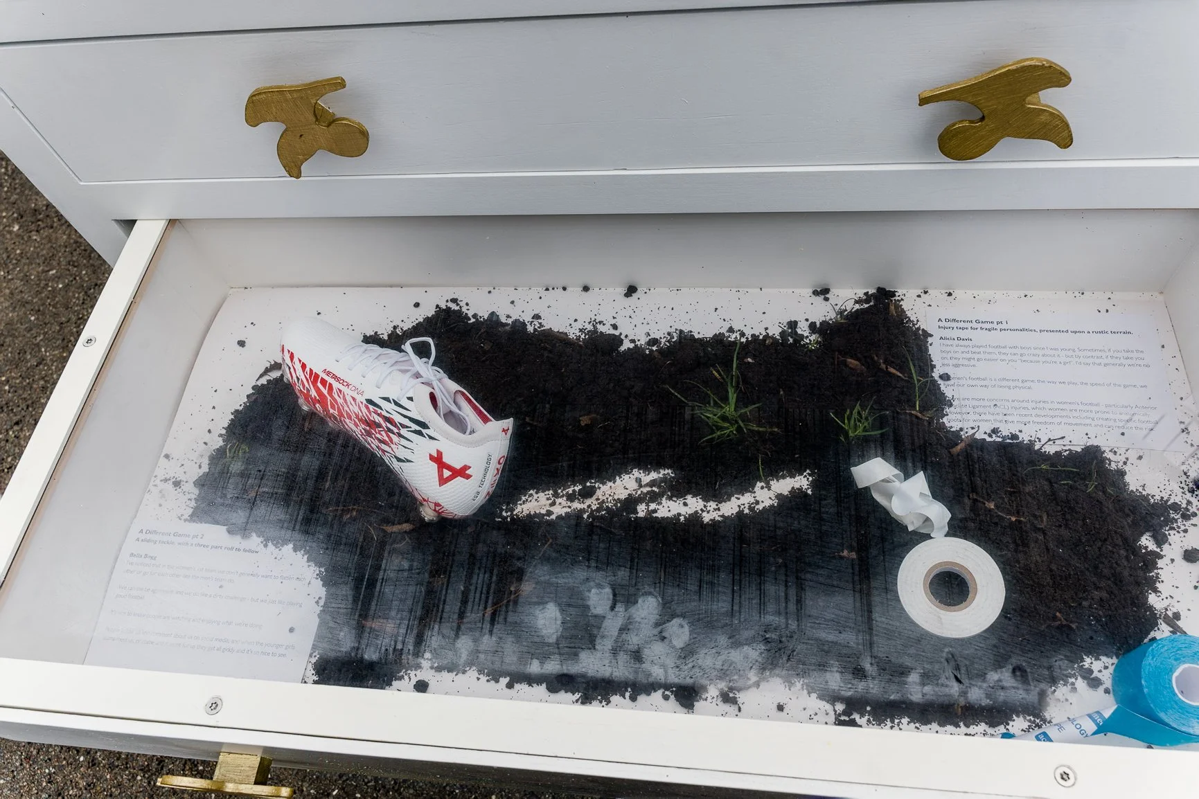 Injury tape for fragile personalities, presented upon a rustic terrain.