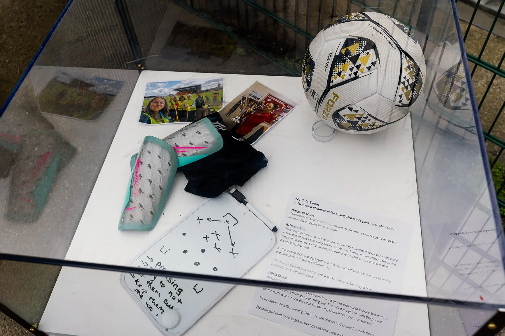A formation planning white board, Brittany’s photo and shin pads